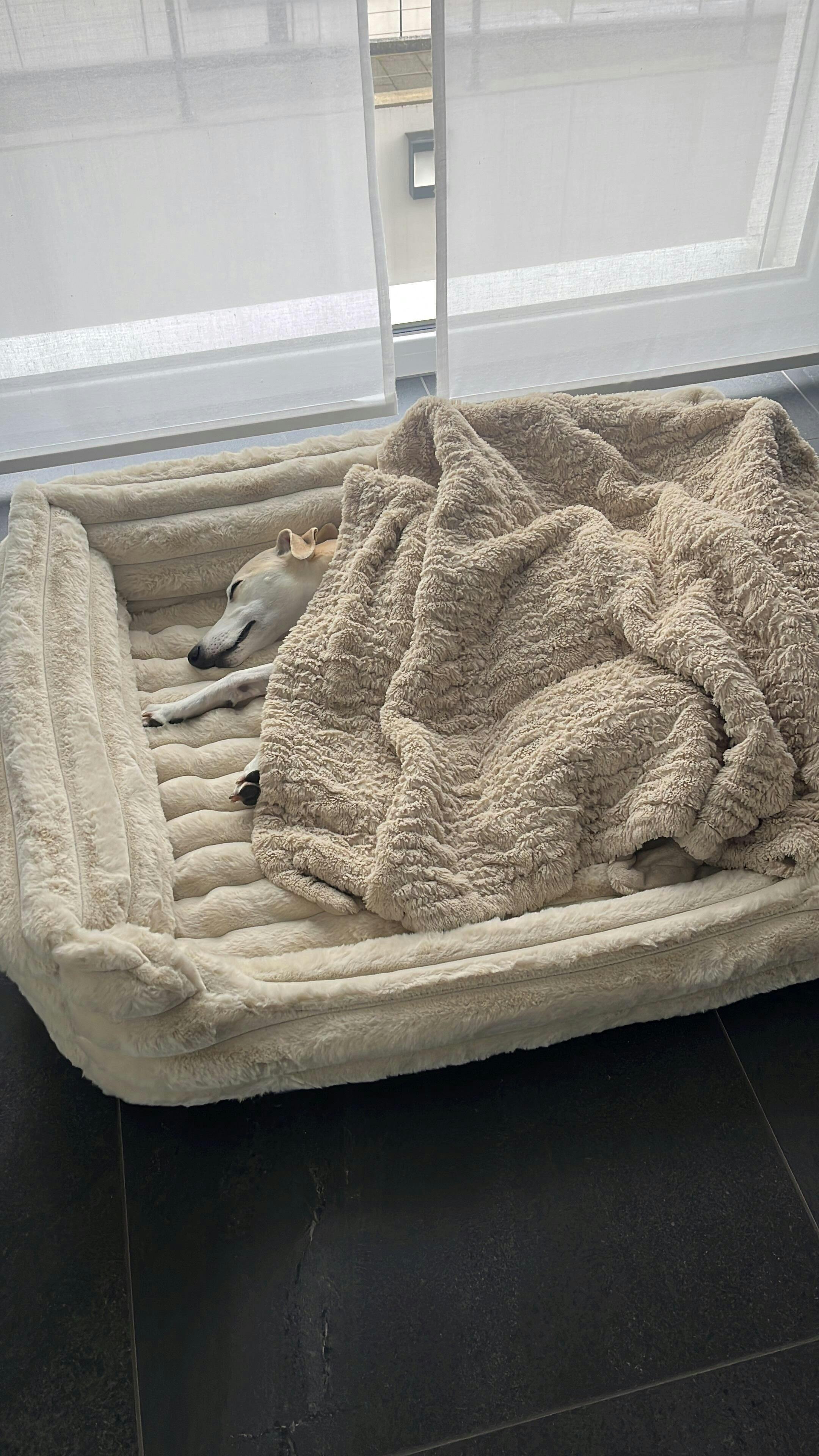 Bin sehr zufrieden mit dem neuen Hundebett und Finn hat auch sehr Freude.