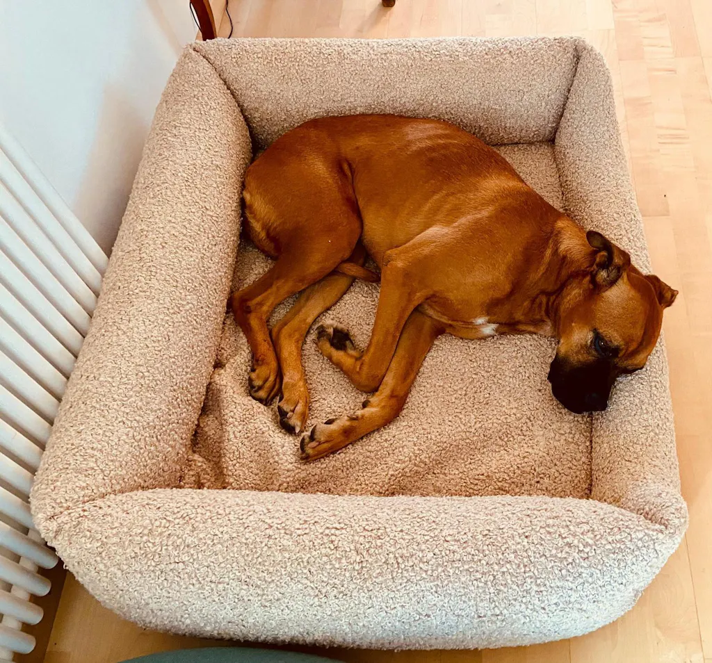 Das Bett sieht nicht nur super aus, es ist offenbar auch sehr bequem und kuschelig. Unser grosser Boxer Mix liegt sehr gerne in seinem neuen XL Bett und hat genug Platz. Qualitatativ hochstehend und sehr gut verarbeitet, super Teddy Stoff, wir haben beige gewählt und gefällt uns sehr gut. Ich kann das Hundebett absolut weiter empfehlen und täte jederzeit wieder so ein Bett kaufen. Vielen Dank, auch für den super Service und schnelle Antwort auf meine Frage.