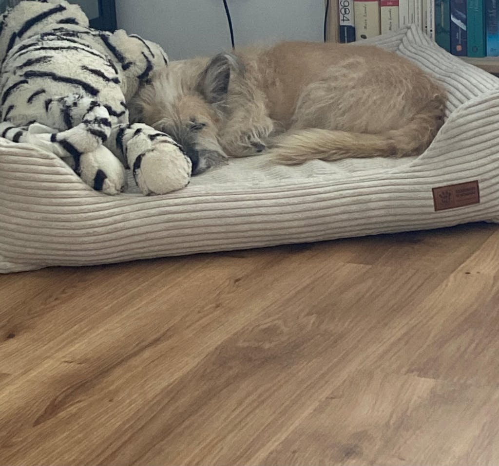 Bin immer noch begeistert. Das Hundebett ist super verarbeitet, sieht richtig gut aus (Cord in hellgrün), die Matratze fühlt sich sehr hochwertig an und das Wichtigste: beide Hunde lieben es.
